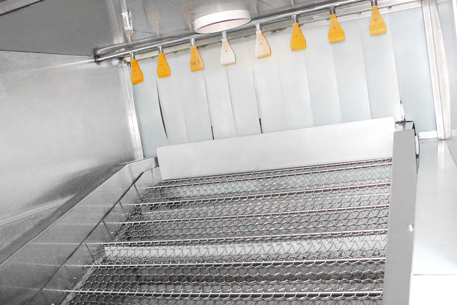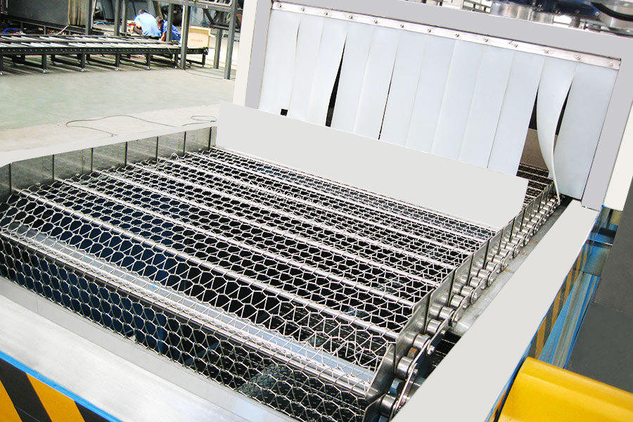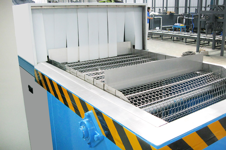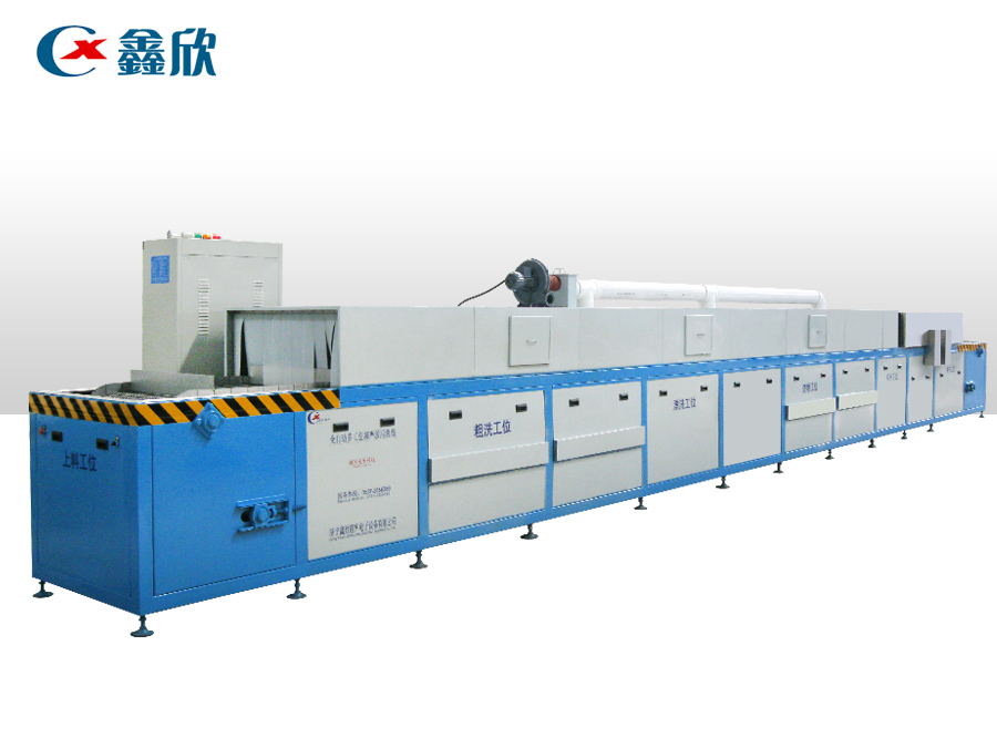 該設備有上下料網(wǎng)帶、超聲波清洗工位、噴淋漂洗工位、高壓風切、熱風烘干工位、溫控水加熱系統(tǒng)、風機、溫控空氣加熱系統(tǒng)、移動式風刀、PLC+觸摸屏控制系統(tǒng)、管路系統(tǒng)及智能電器控制系統(tǒng)等組成。自動進排液和自動加溫系統(tǒng)完全實現(xiàn)了無人干預,自動運行,很大程度上降低了工人的勞動強度。先進的霧氣處理系統(tǒng)可以將清洗時產(chǎn)生的霧氣冷凝回流,空氣經(jīng)過濾和活性炭吸附后排出。