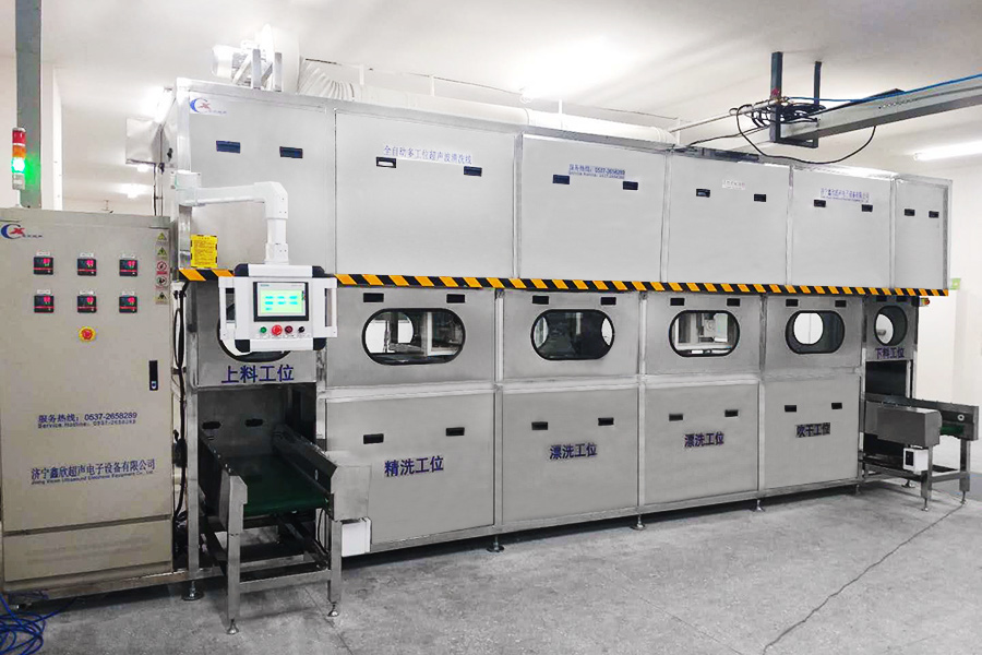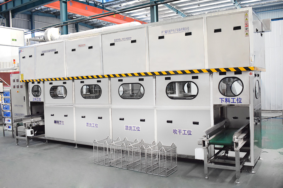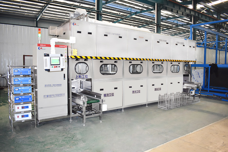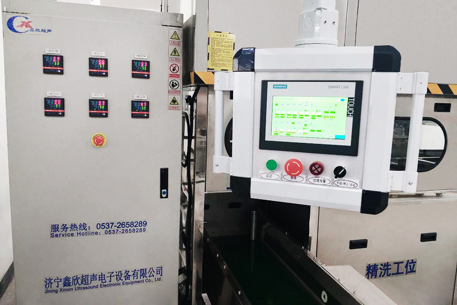 該設(shè)備有自動上下料及轉(zhuǎn)角系統(tǒng)、超聲波清洗系統(tǒng),自動拋動、自動溢流和油污分離裝置,噴淋系統(tǒng)、自動高壓切水系統(tǒng)、自動烘干系統(tǒng)。機(jī)械手自動輸送系統(tǒng)采用高精度直線導(dǎo)軌配合高精度位置檢測傳感器,機(jī)械手可以準(zhǔn)確的實(shí)現(xiàn)工件的抓取和放置。自動進(jìn)排液和自動加溫系統(tǒng)完全實(shí)現(xiàn)了無人干預(yù),自動運(yùn)行,很大程度上降低了工人的勞動強(qiáng)度。先進(jìn)的霧氣處理系統(tǒng)可以將清洗時(shí)產(chǎn)生的霧氣冷凝回流,空氣經(jīng)過濾和活性炭吸附后排出。