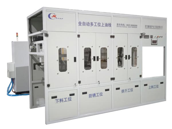 該設備為自動防銹烘干機,采用高壓熱風循環干燥+霧化噴淋工藝,整機采用多臂機械手傳動機構,PLC+ 觸摸屏控制。該設備共4個工位:上料工位、高壓熱風烘干工位、霧 化噴淋防銹工位、下料 工位。該設備還包含循環過濾裝置等。該機結構設計及工藝安排合理、自動化程度高、上油精度高, 有效解決了此類工件的上油難題.