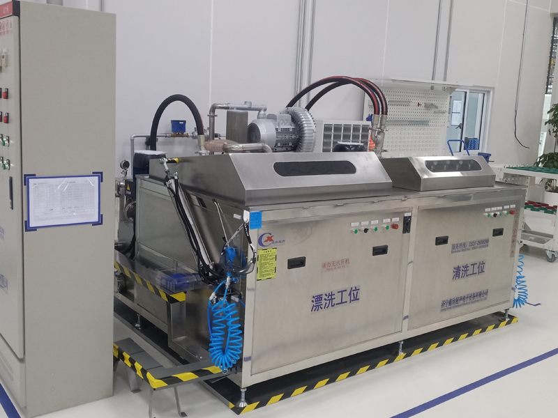 清洗設備包含兩個水平的工位,噴淋超聲波清洗工位、旋轉(zhuǎn)漂洗吹干工位,每個工位均配置人工吹掃氣槍。工藝流程:人工上料→噴淋+超聲波清洗→旋轉(zhuǎn)噴淋漂洗+吹干→人工吊出料框